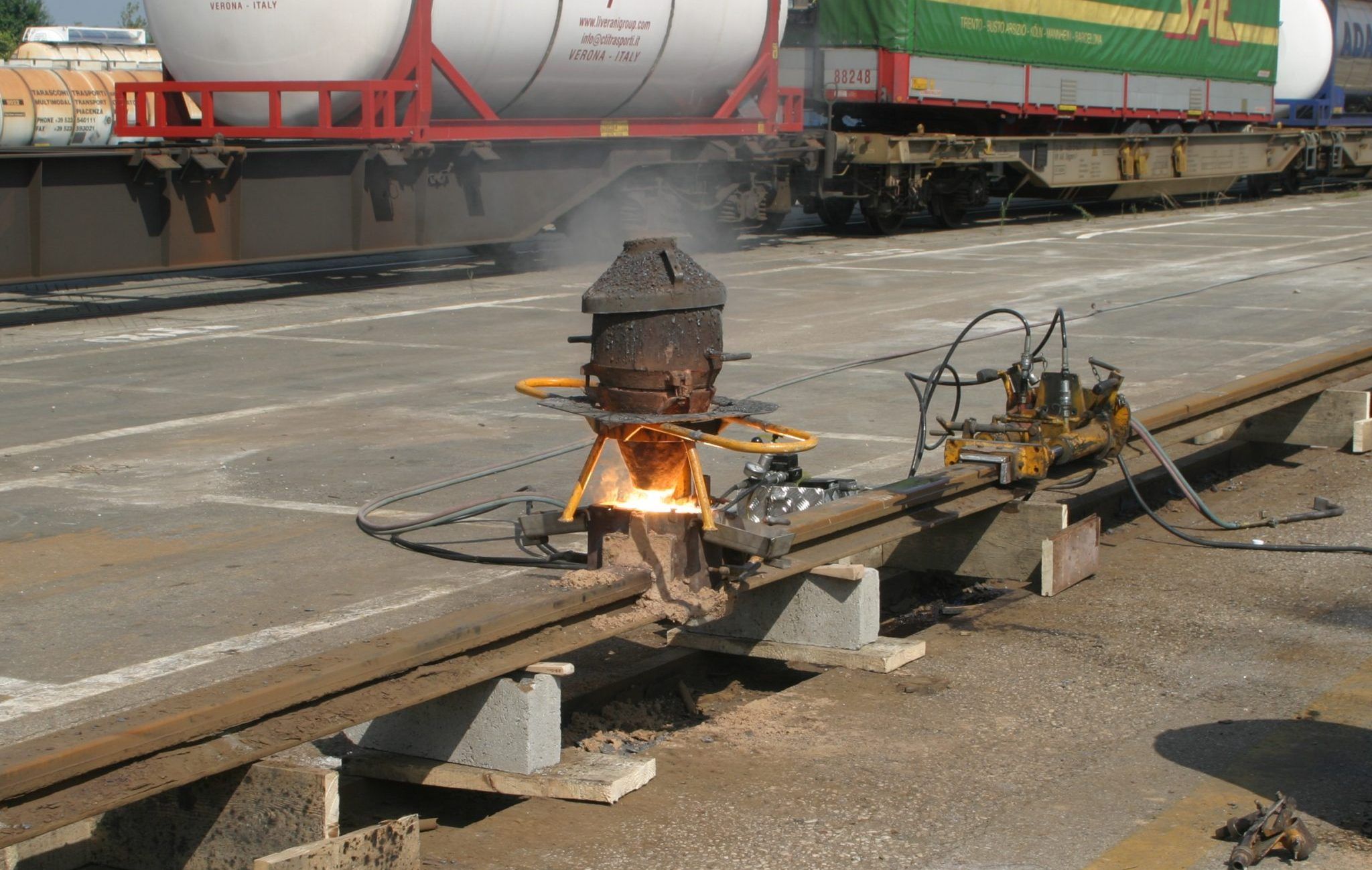L’ unico modo per avere una via di corsa assolutamente liscia, dopo avere eseguito una posa corretta, è quella di saldare le teste delle rotaie con procedimento allumino termico. Questa tecnologia consente di colare in uno stampo refrattario, dello stesso profilo della rotaia, l’acciaio a 2000°C ottenuto combinando l’alluminio con l’ossido di ferro. Una adeguata molatura della parte superiore del “fungo” di rotaia crea di fatto una monorotaia perfetta. Inoltre le nostre squadre di saldatori certificati sono in grado di effettuare saldature sia ad elettrodo che a filo continuo.